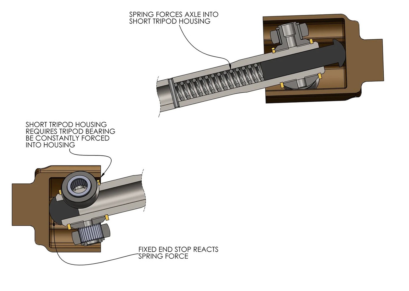 • A plunging system inside the axles/half shafts of the vehicle ensure that the tripod bearings maintain full contact